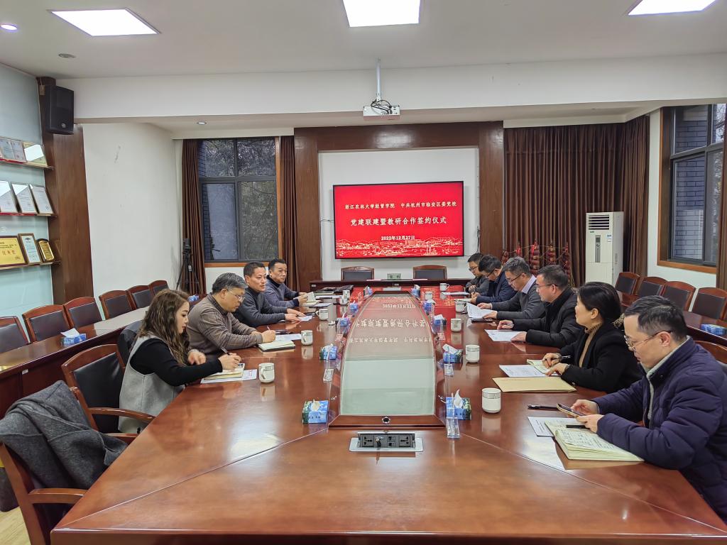 经管学院与临安区委党校签订合作协议 为落实第二轮区校合作相关要求精神,12月27日下午,经管学院与临安区委党校合作协议签约仪式在西大楼208会议室举行。临安区委党校常务副校长袁忠明、副校长吴马峰、副校长潘爱平,经管学院党委书记陈劲松、副院长蔡细平以及双方多名代表参加了本次签约仪式。仪式由副院长蔡细平主持。陈劲松介绍了学院的基本情况和发展目标。他指出,今天的签约是双方积极落实第二轮区校合作相关要求精神的具体行动,是双方深度合作的开端。学院...