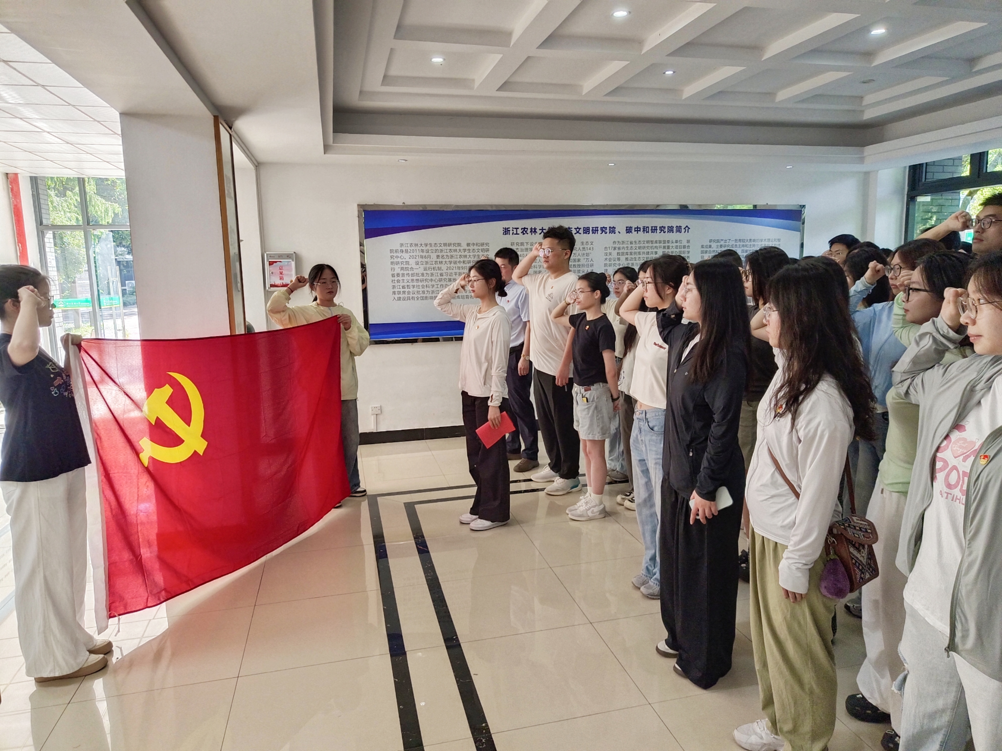 在廉洁教育结束后,两名新发展党员代表发言,表达了入党初心、对党的认识及未来承诺。活动最后,学院举行入党宣誓仪式。学院新发展党员面向党旗,举起右拳庄严宣誓,其余师生党员一同重温入党誓词。铿锵有力的誓言响彻会场,传递出师生党员对党的忠诚与为共产主义事业奋斗终生的决心。