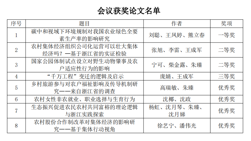 会上,学者专家们围绕推进城乡融合、迈向共同富裕、赋能乡村振兴、“千万工程”的辩证法、浙江省创意农业发展等议题分享了相关领域最新学术与实践成果。本次会议对优秀论文进行了评选和颁奖,共评选出一等奖论文3篇,二等奖论文5篇,三等奖论文9篇,优秀奖论文20篇。其中,我院共有8篇论文获奖,包括一等奖论文1篇,二等奖论文2篇,三等奖论文1篇,优秀奖论文4篇。
