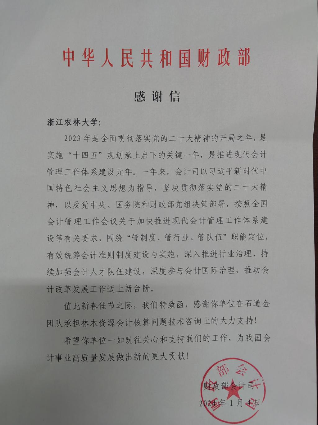 日前,财政部会计司专门给我校发来感谢信。信中高度肯定了我院石道金教授团队在财政部会计司工作中克难攻坚、勇挑重担,对推进现代会计管理工作体系建设过程中做出的辛勤付出表示了充分肯定。并对我院围绕中心、服务大局,积极推动会计改革发展工作做出的突出贡献表达了诚挚谢意。