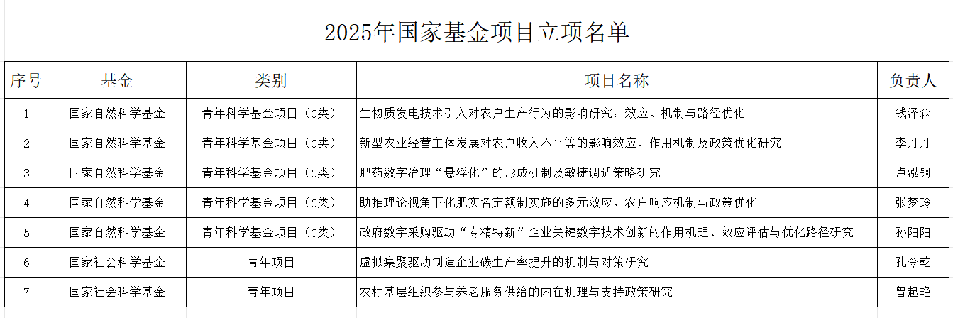 近日,国家自然科学基金委和全国哲学社会科学工作办公室分别公布了2025年项目评审结果,我院分别有5项国家自科基金项目和2项国家社科基金项目拟立项。其中国家自然科学基金拟立项数实现了学院历史突破。
