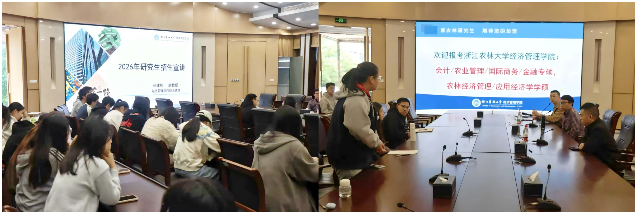 10月21日下午,学院农林经济管理学术型硕士点负责人沈政副教授首站走进衢州学院,与商学院谢璟晅老师及90余位2027届毕业生齐聚一堂。宣讲中,沈老师结合最新招生政策与历年数据拆解报考难度,详细介绍了学院研究生学位点核心优势,还通过详实案例展示学院研究生就业图景和培养特点,让学子直观感受“双导师制”与“硕博联动”的育人成果。