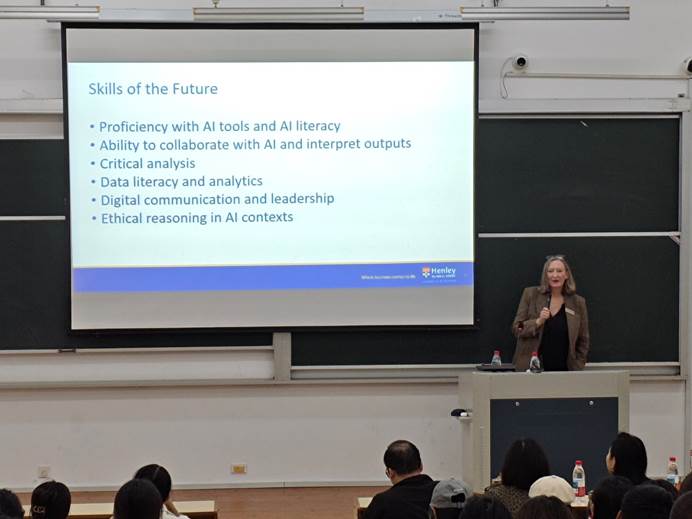 作为商业史专家,Lucy Newton教授为经管学院同学作了《人工智能重塑商业:机遇与挑战》的专题报告。她以“人工智能如何重塑商业”为核心,向同学们介绍了 AI 在商科领域的应用现状,结合当前商科学生就业困惑,拆解当下热门商科岗位的真实工作场景,说明能力需求重塑的紧迫性,帮助学生清晰定位未来学习重点。