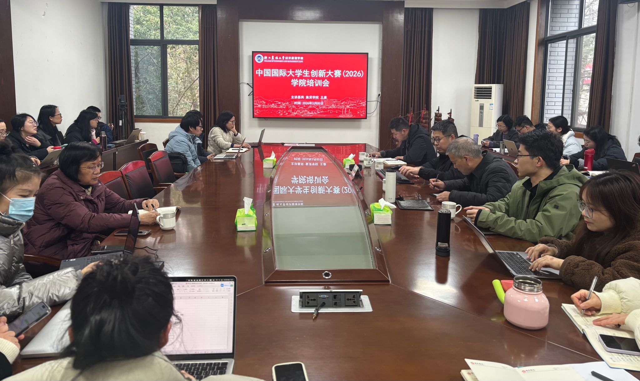 为做好中国国际大学生创新大赛(2026)备赛工作,提升学院项目指导水平和参赛竞争力,3月20日,经管学院在学院楼208会议室召开学院培训会。学院院长吴伟光、乡村振兴研究院院长沈月琴出席会议,各学科专业负责人、近三年入职青年教师及部分竞赛指导教师参加培训。会议由院党委副书记曹磊主持。