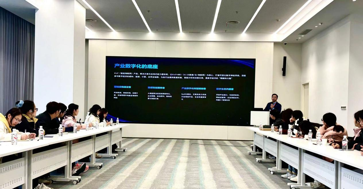 随后,宇视科技高管人员与全体学员在会议室进行了面对面讨论交流。宇视科技高管以“数字经济”为主题,结合宇视科技企业的发展实践,从行业地位、全球业务、研发布局及多元应用场景等方面,详细介绍了企业发展情况,让学员们直观理解了数字技术赋能实体经济的核心逻辑与广阔前景。学员们也结合自身专业方向与职业规划,围绕企业运营策略、全球市场拓展、企业数字经济发展、个人成长等问题向宇视科技高管们虚心请教。宇视科技海外运营部陈经理凭借多年的行业积淀与实战经验,不仅逐一为学员答疑解惑,更将科技企业的管理智慧与职场成长的宝贵心得倾囊相授,为学员们规划未来职业发展提供高价值的指导与参考。
