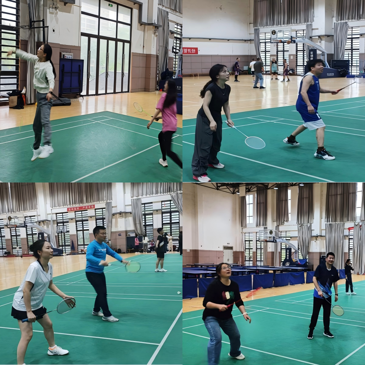 比赛紧张而精彩,发球、扣杀、吊球、网前截击……选手们步伐灵活、配合默契,每一次精彩的攻防都引来阵阵喝彩。无论是经验丰富的老将,还是初露锋芒的新秀,大家都全力以赴,展现出顽强拼搏的体育精神。欢声笑语间,平日里讲台上的严谨与专注化作赛场上的活力与激情。