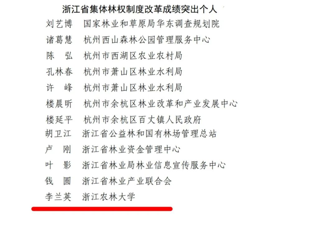 近日,浙江省绿化和自然保护地委员会公布了《浙江省绿化与自然保护地委员会关于表扬浙江省集体林权制度改革成绩突出集体和个人的通报》,李兰英教授获评浙江省集体林权制度改革成绩突出个人。
