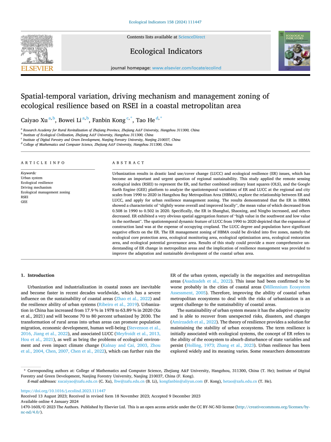 由我院徐彩瑶副教授(第一作者)、李博伟副教授、孔凡斌教授(通讯作者)等共同撰写的论文《Spatial-temporal variation, driving mechanism and management zoning of ecological resilience based on RSEI in a coastal metropolitan area》在SCI Top期刊《Ecological Indicators》发表。该论文是徐彩瑶副教授主持的国家自然科学基金青年项目(42301328)、浙江省高校重大人文社科攻关计划青年重点项目(2021QN062)的阶段性成果。