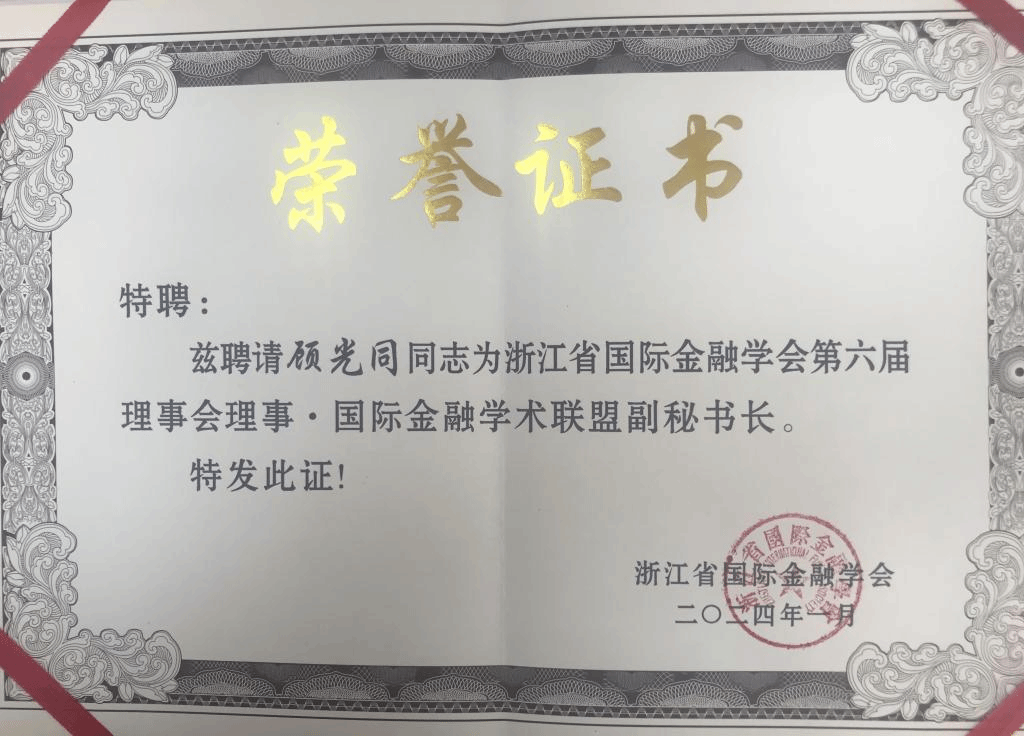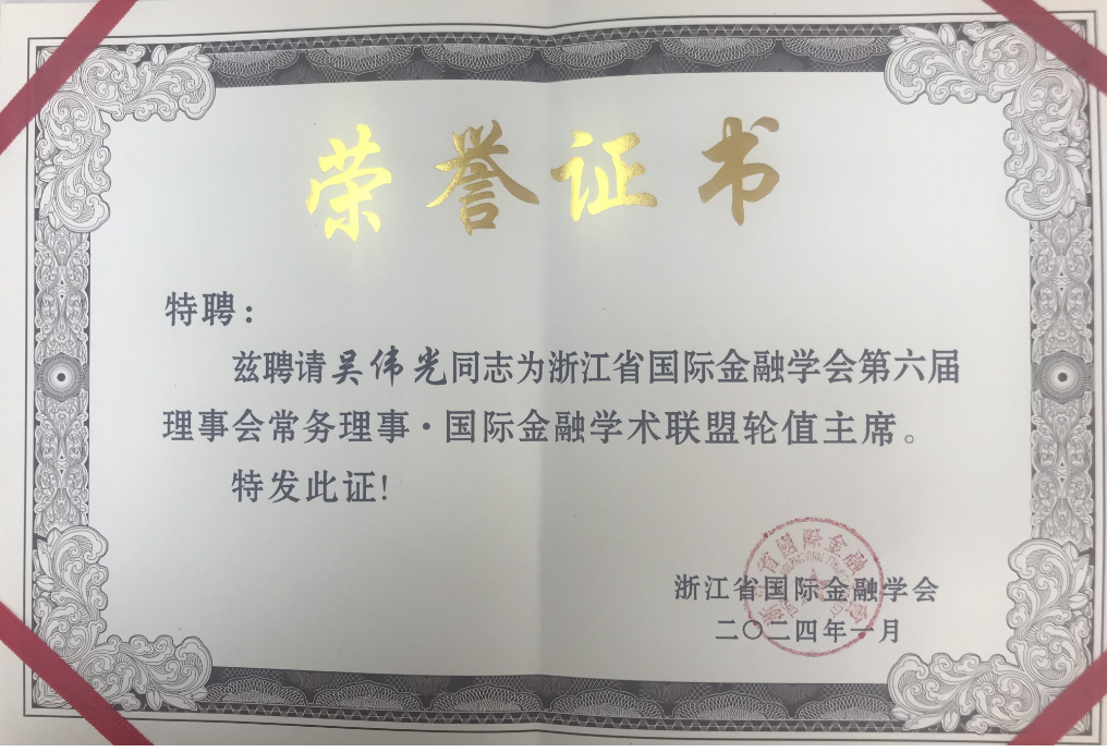 为深入贯彻落实党的二十大精神和习近平总书记关于国际金融形势及金融服务工作的重要论述精神,推进“浙江省国际金融学术联盟”工作的全面实施,进一步营造浓厚学术氛围,增进我省金融学术界、金融工作者同仁的学术交流与合作,提升我省国际金融研究成果质量和研究水平,促进学术繁荣发展,服务浙江金融强省建设。1月13日下午,第十七届浙江金融投资论坛暨2023年浙江省国际金融学术年会在浙江大学召开。大会指导单位为浙江省社会科学界联合会,主办单位为科技金融时报、浙江省国际金融学会和浙江金融投资论坛组委会。大会召集成立浙江省国际金融学术联盟,我校作为浙江省国际金融学术联盟理事单位之一,受邀参与成立仪式。会上,学院院长吴伟光教授被聘为浙江省国际金融学会第六届理事会常务理事、国际金融学术联盟轮值主席,顾光同教授被聘为浙江省国际金融学会第六届理事会理事、国际金融学术联盟副秘书长。