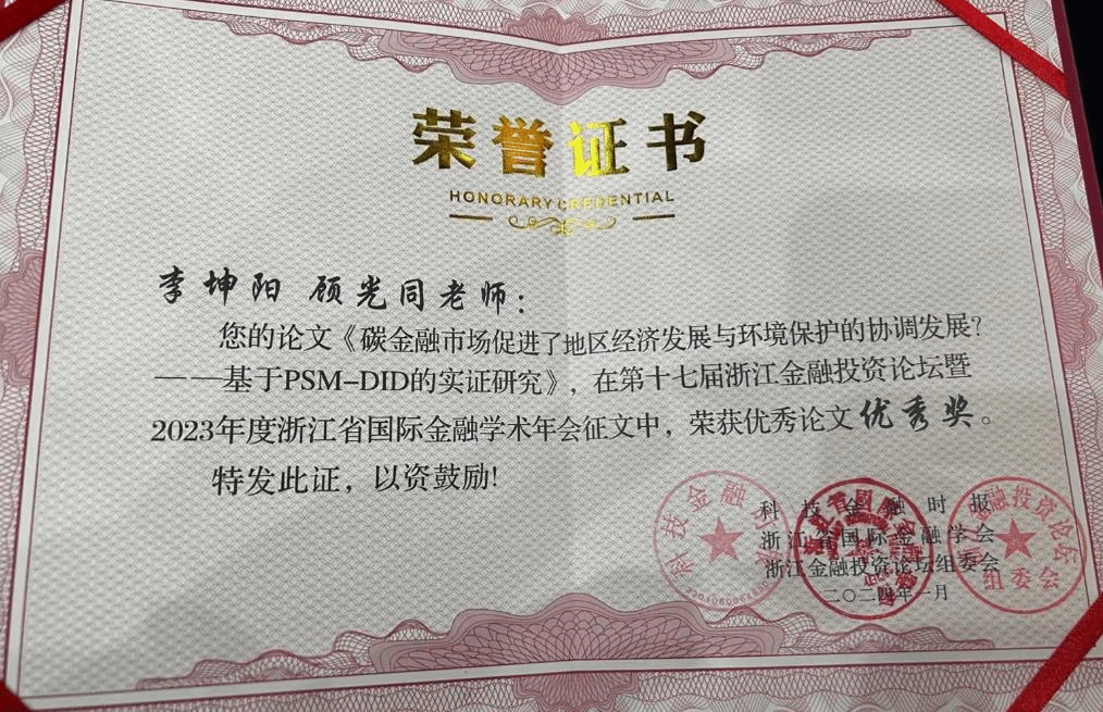 大会还举行了2023年度学术成果优秀论文颁奖仪式。本次征文收到来自浙江大学、浙江工商大学、Williamhill中文等多所省内外高校专家学者的论文投稿,顾光同教授指导的农业管理研究生李坤阳撰写的论文《碳金融市场促进了地区经济发展与环境保护的协调发展?——基于PSM-DID的实证研究》荣获优秀论文优秀奖。