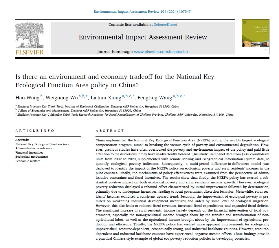我院吴伟光教授团队撰写的学术论文《Is there an environment and economy tradeoff for the National Key Ecological Function Area policy in China?》在SSCI期刊《Environmental Impact Assessment Review》发表,论文第一作者为2021级农业管理专业硕士生王浩,由吴伟光教授、王凤婷副教授和熊立春副教授共同参与撰写并指导,该期刊为中科院一区Top期刊,西安交通大学等认定的管理类国际知名期刊,期刊影响因子为6.122。