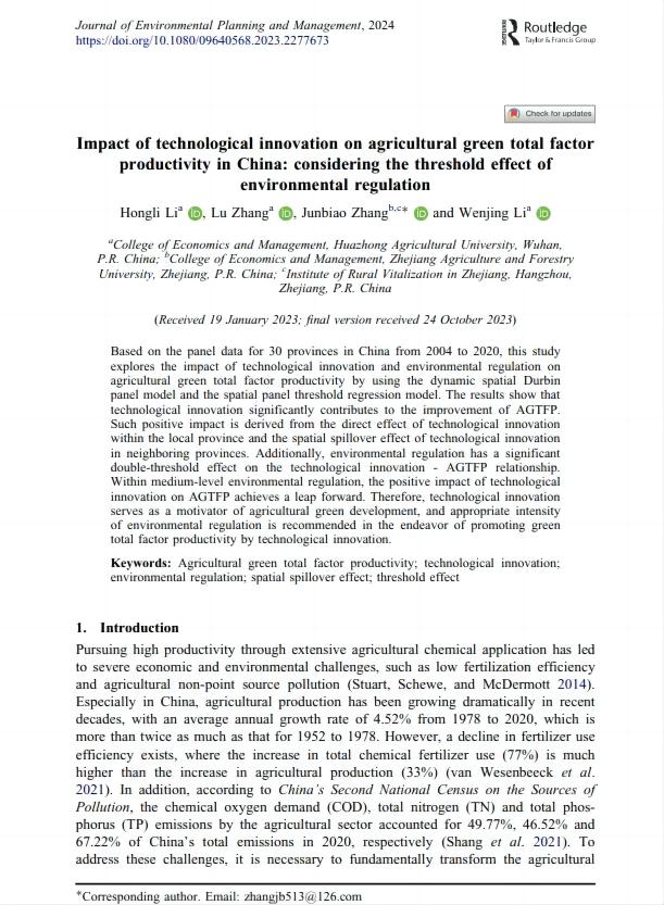 近日,张俊飚教授(通讯作者)与华中农业大学WilliamHILL中国博士生李红莉、张露教授以及李文静副教授在环境规划与管理领域著名期刊《Journal of Environmental Planning and Management》(SSCI,JCRQ2,中科院4区,IF=3.9)发表了题为“Impact of technological innovation on agricultural green total factor productivity in China: considering the threshold effect of environmental regulation”的研究论文。研究探究了技术创新对中国农业绿色全要素生产率提升的空间溢出效应,同时揭示了不同环境规制作用下技术创新对中国农业绿色全要素生产率的异质性门槛效应。