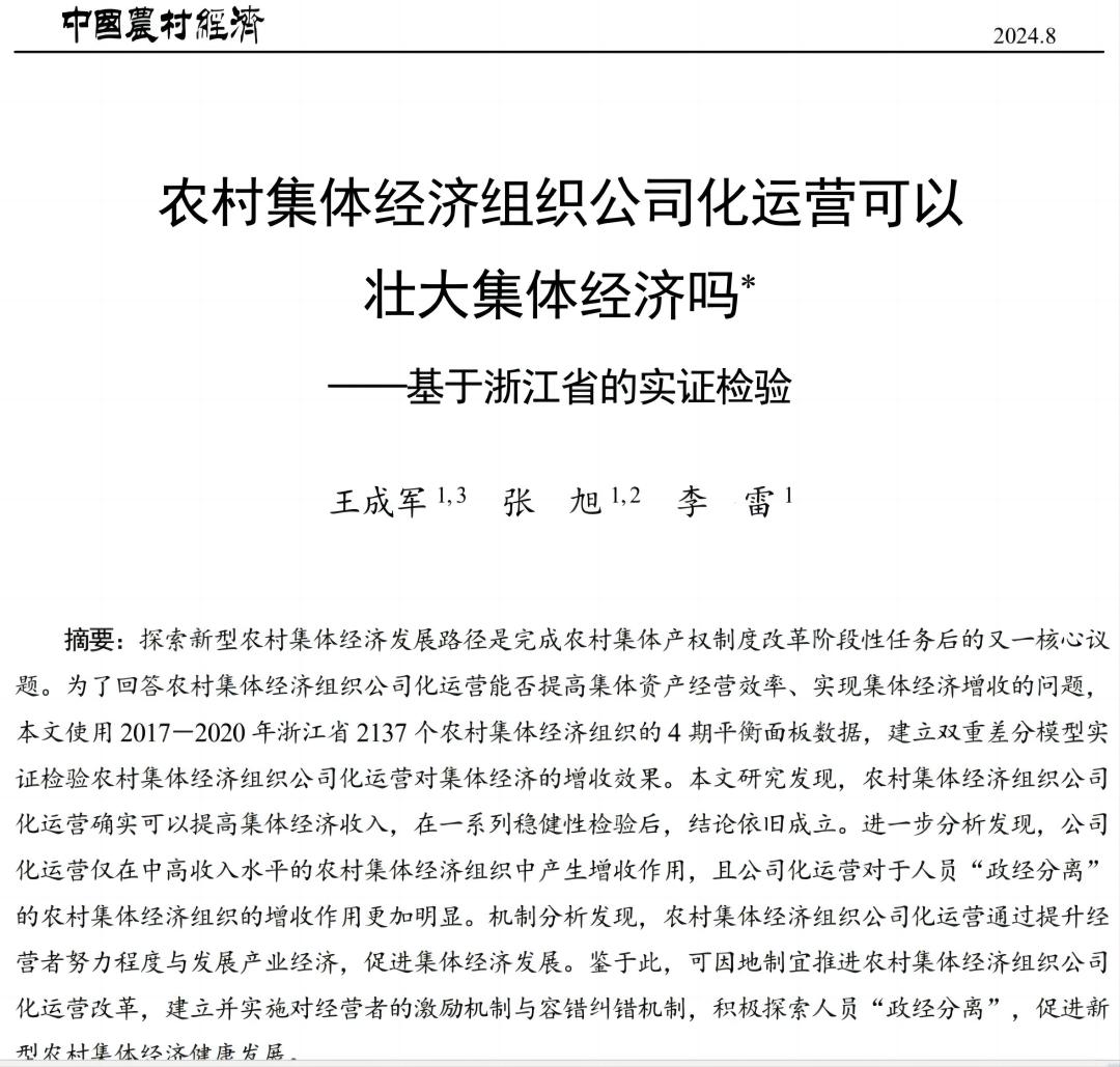 近期,王成军教授与学院博士生张旭、李雷博士等团队成员合作撰写的论文《农村集体经济组织公司化运营可以壮大集体经济吗?——基于浙江省的实证检验》在《中国农村经济》第8期发表。