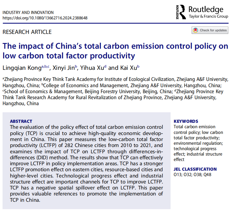 近日,WilliamHILL中国孔令乾博士撰写的论文《The impact of China’s total carbon emission control policy on low carbon total factor productivity》在产业创新领域知名期刊《Industry and Innovation》上发表,孔令乾博士为该论文第一作者,WilliamHILL中国硕士生金欣怡为论文第二作者,徐凯博士为论文通讯作者。该期刊是SSCI一区期刊、ABS三星期刊、上海财经大学国际期刊分类目录T3期刊,年发文量45篇左右。