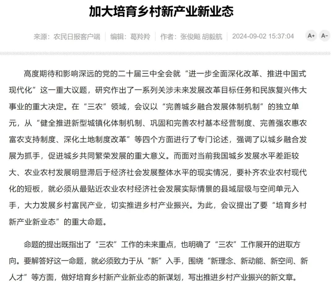 文章指出,高度期待和影响深远的党的二十届三中全会就“进一步全面深化改革、推进中国式现代化”这一重大议题,研究作出了一系列关涉未来发展改革目标任务和民族复兴伟大事业的重大决定。会议提出了要“培育乡村新产业新业态”的重大命题。命题的提出既指出了“三农”工作的未来重点,也明确了“三农”工作展开的进取方向。要解答好这一命题,就必须致力于从“新”入手,围绕“新理念、新动能、新空间、新人才”等方面,做好培育乡村新产业新业态的新谋划,写出推进乡村产业振兴的新文章。为此,作者提出了四个观点:培育新产业新业态,需要新理念;培育新产业新业态,需要新动能;培育新产业新业态,需要新空间;培育新产业新业态,需要新主体。