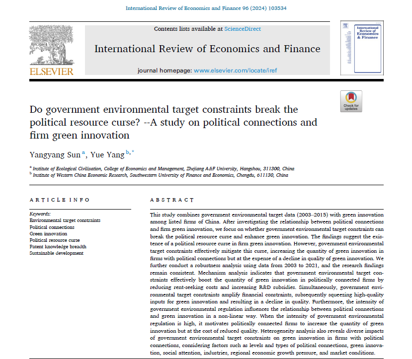近日,我院应用经济学学科孙阳阳博士撰写的论文《Do government environmental target constraints break the political resource curse?—A study on political connections and firm green innovation》上发表,孙阳阳博士为该论文第一作者。该期刊是SSCI一区期刊,最新影响因子为4.8。