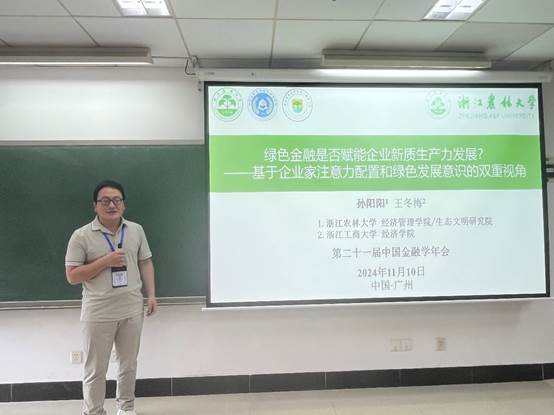 此次年会分为开幕式、主旨演讲、颁奖典礼、获奖论文报告和平行论坛等部分。在绿色金融专题分会场,我院孙阳阳博士作了题为《绿色金融是否赋能企业新质生产力发展?——基于企业家注意力配置和绿色发展意识的双重视角》的论文汇报。孙阳阳博士的文章聚焦于绿色金融政策和企业新质生产力之间的因果关系,并对其内在机制、经济后果进行了深入分析。参会老师和同学对该论文进行了热烈讨论。点评嘉宾从研究视角、研究方法、研究框架等方面肯定了该研究的价值,并提出了进一步完善的中肯建议。