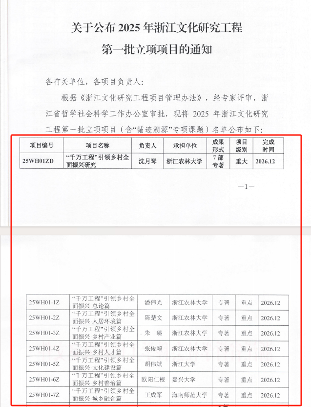 近日,浙江省哲学社会科学工作办公室公布了2025年浙江文化研究工程第一批立项项目名单,由我院沈月琴教授主持的《“千万工程”引领乡村全面振兴研究》课题(项目编号:25WH01ZD)成功立项,项目级别为重大。