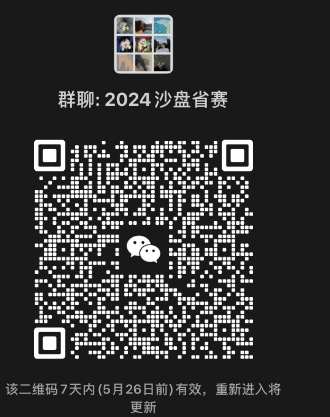 2、报名方式:扫码加入微信群(二维码见附图,注意二维码5.26过期,过期后可加联系人微信,并说明参加“沙盘赛”即可),报名同学务必加入此交流群,后续训练和比赛安排将会在群里进行通知。