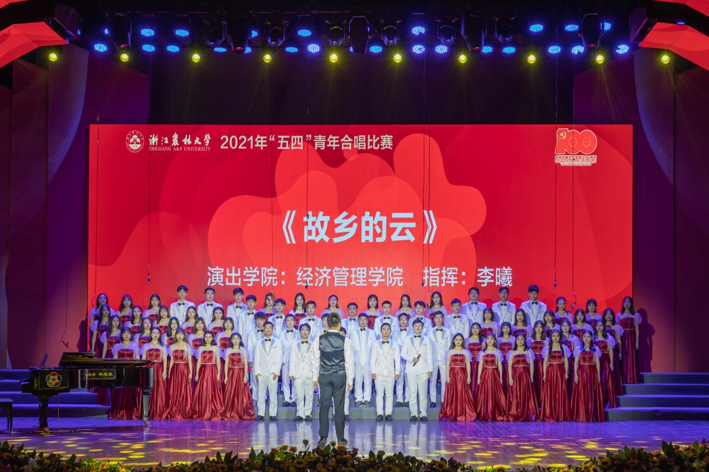 之后,青年合唱比赛正式开始,我院参赛队伍男生身着白色西服套装、女生身着红色礼服隆重登场。在一名男生深切、悠长地朗诵两小节余光中的《乡愁》之后,《故乡的云》伴奏响起,随着李曦老师专业而又深情的指挥,男低音独唱、女高音轻声伴唱、女低音男低音娓娓道来,“归来吧、归来哟,浪迹天涯的游子……”,都诉说着浓浓的思乡之情以及急切盼望海峡两岸统一的渴望之情。随着舞蹈演员柔美的起舞,我院队伍的演唱赢得了台下观众热烈的掌声。最终,我院以95.7分的高分卫冕合唱比赛冠军。