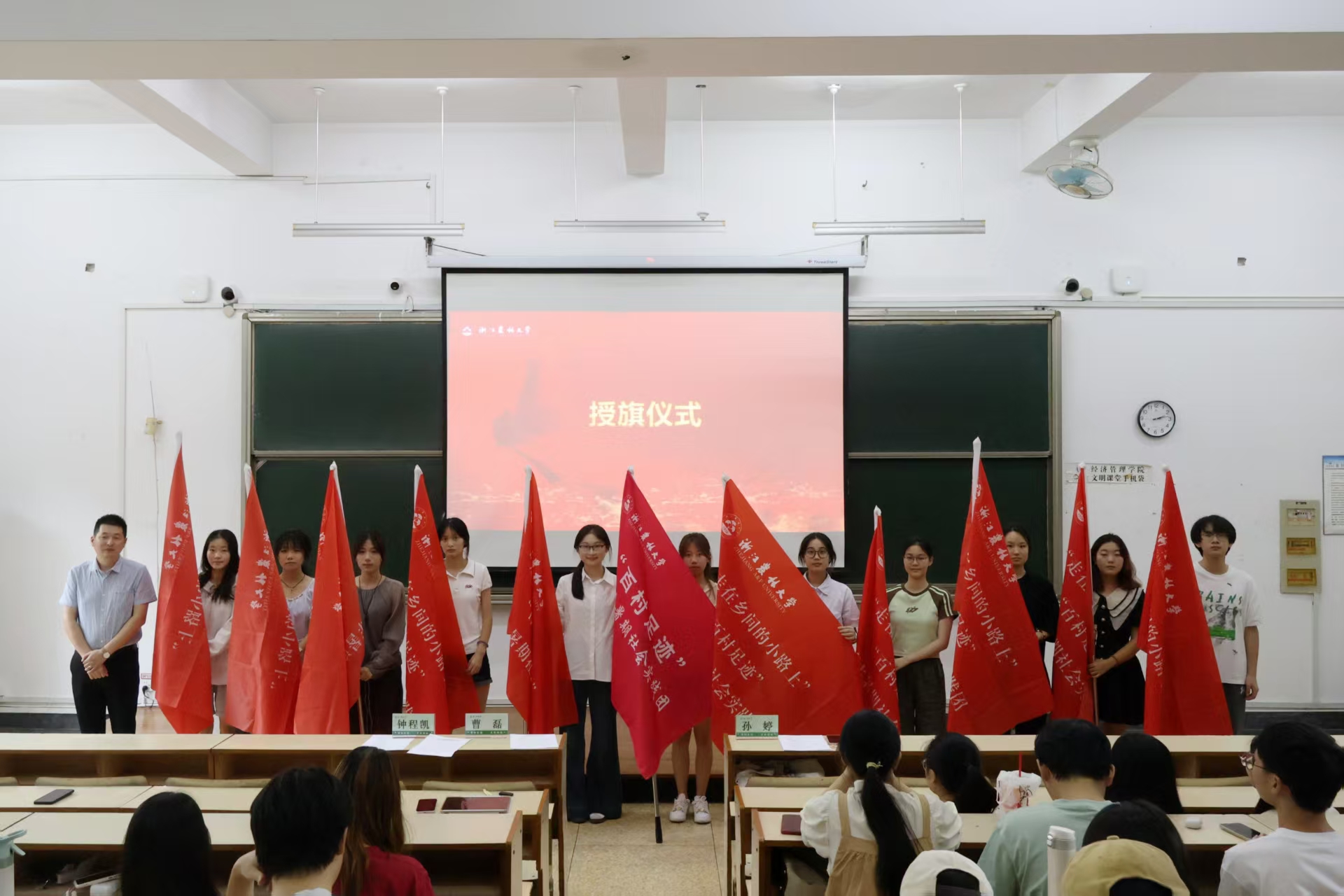 随后,会上还进行了授旗仪式、社会实践宣传培训、安全教育和优秀团队经验分享,学生纷纷承诺将以严谨态度和科学方法开展调研工作,以团队合作和相互支持面对挑战,以积极态度和饱满热情投身调研实践。